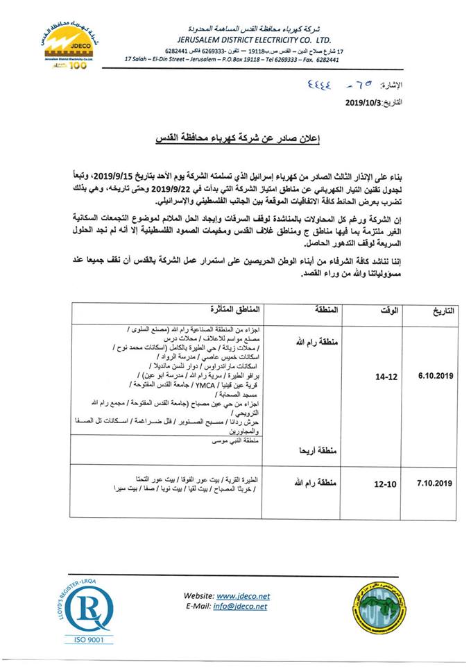 شفا – ستعاود شركة الكهرباء الاسرائيلية قطع التيار الكهربائي عن مناطق في محافظتي رام الله وبيت لحم ايام (الاحد والاثنين والخميس) من الاسبوع القادم.